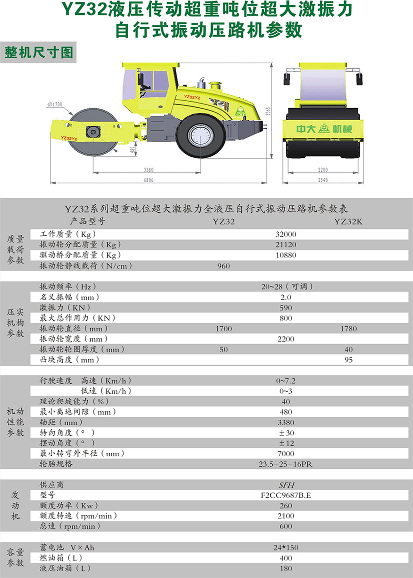 YZ32 超重噸位超大激振力全液壓自行式單鋼輪振動(dòng)壓路機(jī)